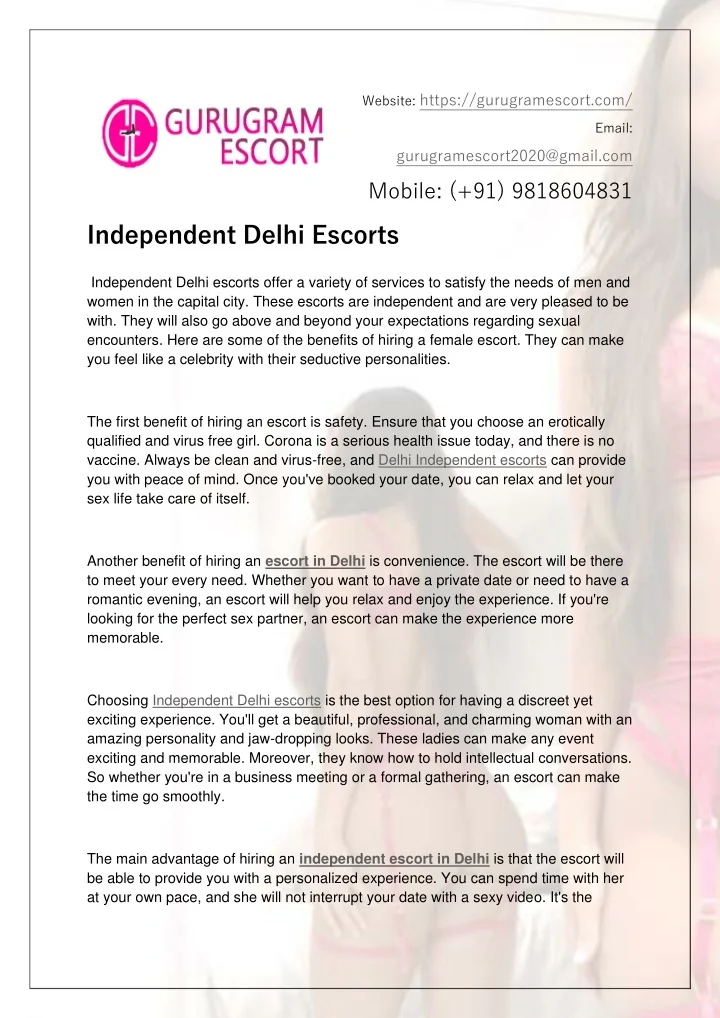 Website: https://gurugramescort.com/ Email: gurugramescort2020@gmail.com Mobile: (+91) 9818604831 Independent Delhi Escorts Independent Delhi escorts offer a variety of services to satisfy the needs of men and women in the capital city. These escorts are independent and are very pleased to be with. They will also go above and beyond your expectations regarding sexual encounters. Here are some of the benefits of hiring a female escort. They can make you feel like a celebrity with their seductive personalities. The first benefit of hiring an escort is safety. Ensure that you choose an erotically qualified and virus free girl. Corona is a serious health issue today, and there is no vaccine. Always be clean and virus-free, and Delhi Independent escorts can provide you with peace of mind. Once you've booked your date, you can relax and let your sex life take care of itself. Another benefit of hiring an escort in Delhi is convenience. The escort will be there to meet your every need. Whether you want to have a private date or need to have a romantic evening, an escort will help you relax and enjoy the experience. If you're looking for the perfect sex partner, an escort can make the experience more memorable. Choosing Independent Delhi escorts is the best option for having a discreet yet exciting experience. You'll get a beautiful, professional, and charming woman with an amazing personality and jaw-dropping looks. These ladies can make any event exciting and memorable. Moreover, they know how to hold intellectual conversations. So whether you're in a business meeting or a formal gathering, an escort can make the time go smoothly. The main advantage of hiring an independent escort in Delhi is that the escort will be able to provide you with a personalized experience. You can spend time with her at your own pace, and she will not interrupt your date with a sexy video. It's the