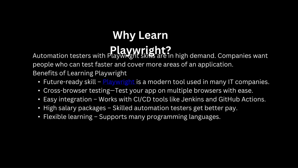 3. Why Learn Playwright? • Automation testers with Playwright skills are in high demand. Companies want people who can test faster and cover more areas of an application. • Benefits of Learning Playwright • Future-ready skill – Playwright is a modern tool used in many IT companies. • Cross-browser testing—Test your app on multiple browsers with ease. • Easy integration – Works with CI/CD tools like Jenkins and GitHub Actions. • High salary packages – Skilled automation testers get better pay. • Flexible learning – Supports many programming languages.