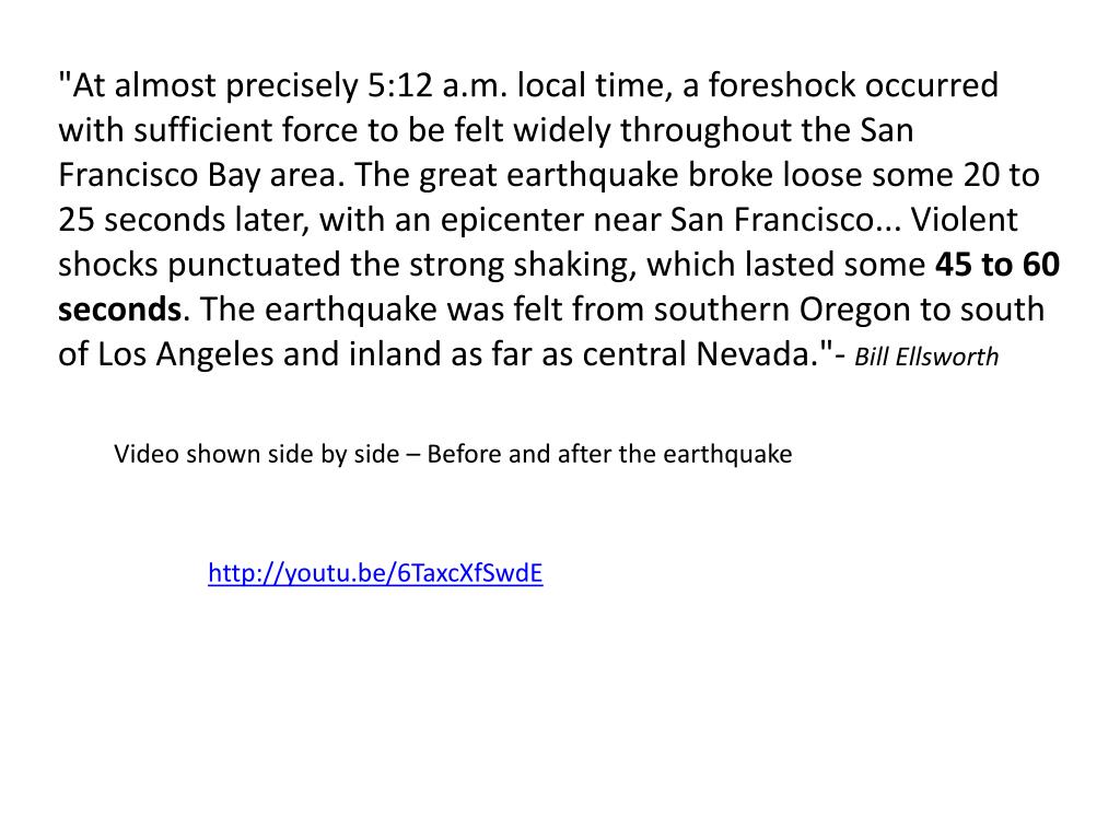"At almost precisely 5:12 a.m. local time, a foreshock occurred with sufficient force to be felt widely throughout the San Francisco Bay area. The great earthquake broke loose some 20 to 25 seconds later, with an epicenter near San Francisco... Violent shocks punctuated the strong shaking, which lasted some 45 to 60 seconds. The earthquake was felt from southern Oregon to south of Los Angeles and inland as far as central Nevada."- Bill Ellsworth Video shown side by side – Before and after the earthquake http://youtu.be/6TaxcXfSwdE