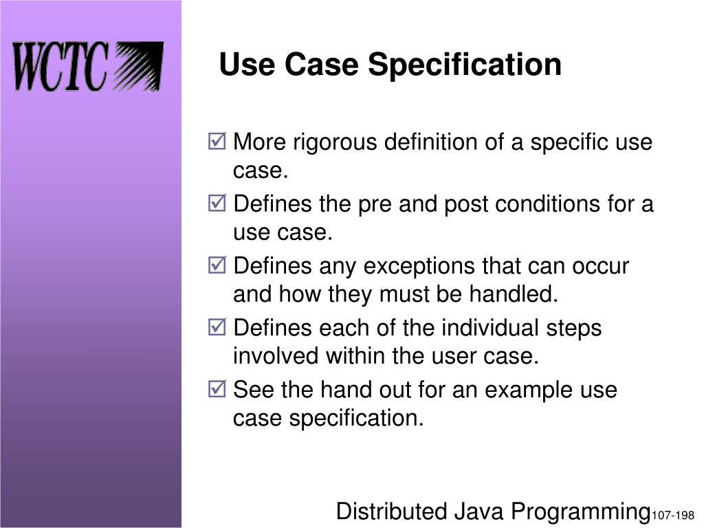 More rigorous definition of a specific use case. Defines the pre and post conditions for a use case. Defines any exceptions that can occur and how they must be handled. Defines each of the individual steps involved within the user case. See the hand out for an example use case specification. Use Case Specification