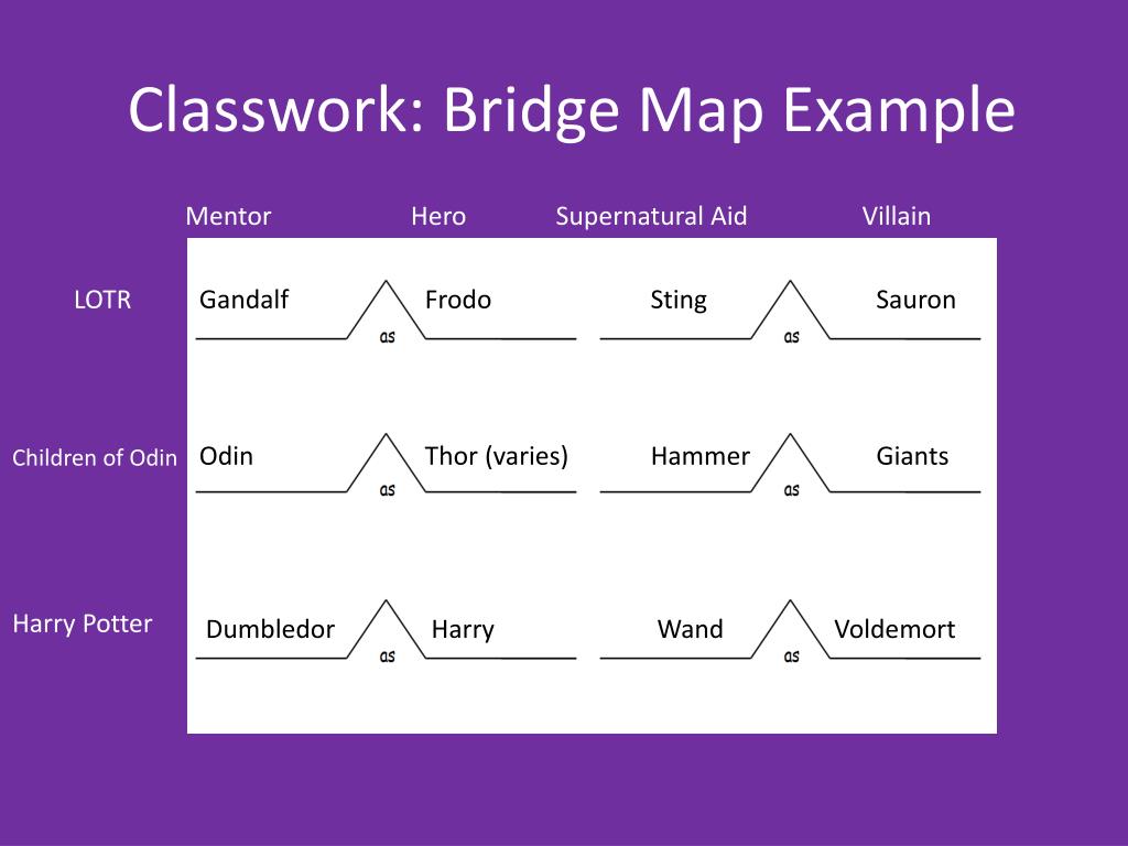 Classwork: Bridge Map Example Mentor Hero Supernatural Aid Villain LOTR Gandalf Frodo Sting Sauron Odin Thor (varies) Hammer Giants Children of Odin Harry Potter Dumbledor Harry Wand Voldemort