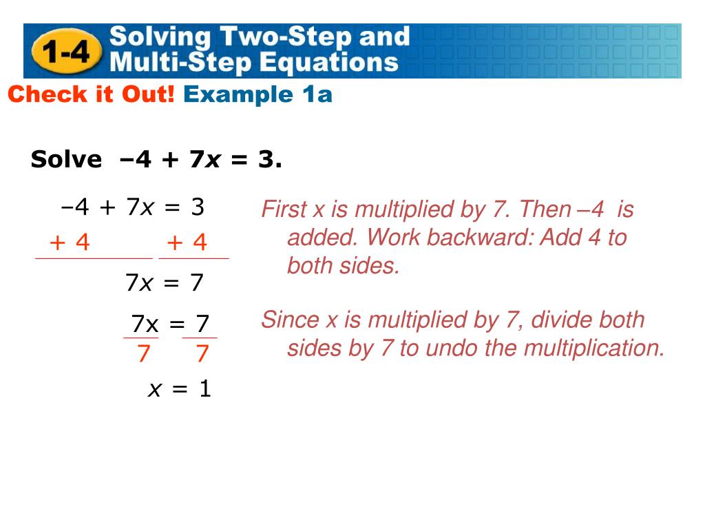 + 4 + 4 7x = 7 7 7 Check it Out! Example 1a Solve –4 + 7x = 3. –4 + 7x = 3 First x is multiplied by 7. Then –4 is added. Work backward: Add 4 to both sides. 7x = 7 Since x is multiplied by 7, divide both sides by 7 to undo the multiplication. x = 1