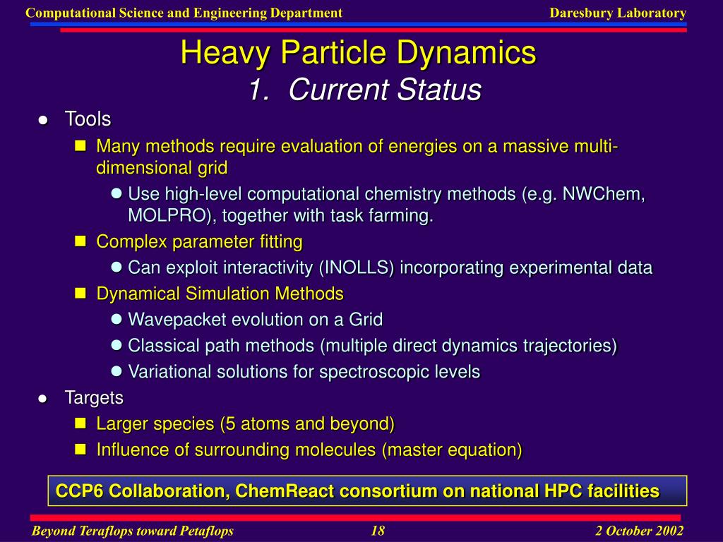 Heavy Particle Dynamics 1. Current Status • Tools • Many methods require evaluation of energies on a massive multi-dimensional grid • Use high-level computational chemistry methods (e.g. NWChem, MOLPRO), together with task farming. • Complex parameter fitting • Can exploit interactivity (INOLLS) incorporating experimental data • Dynamical Simulation Methods • Wavepacket evolution on a Grid • Classical path methods (multiple direct dynamics trajectories) • Variational solutions for spectroscopic levels • Targets • Larger species (5 atoms and beyond) • Influence of surrounding molecules (master equation) CCP6 Collaboration, ChemReact consortium on national HPC facilities 18
