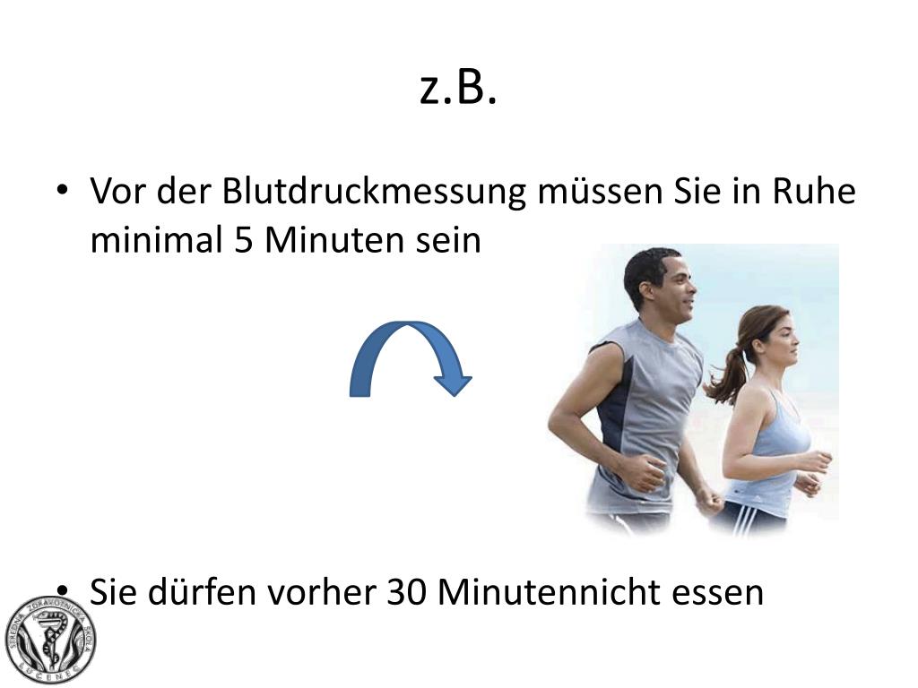 z.B. • Vor der Blutdruckmessungmüssen Sie in Ruhe minimal 5 Minuten sein • Sie dürfen vorher 30 Minutennicht essen