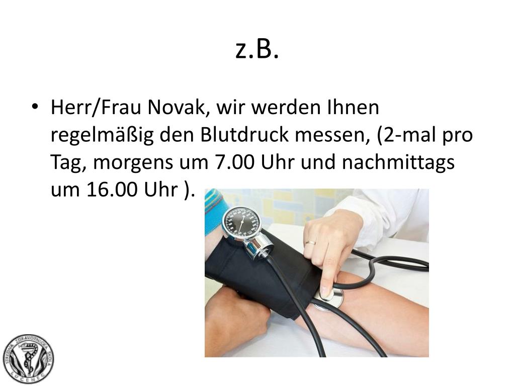 z.B. • Herr/Frau Novak, wir werden Ihnen regelmäßig den Blutdruck messen,(2-mal pro Tag, morgens um7.00 Uhr und nachmittags um 16.00 Uhr ).