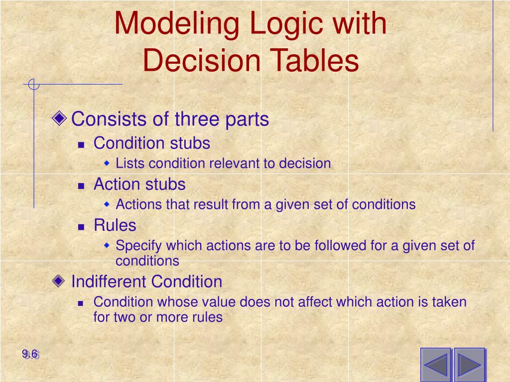 Modeling Logic withDecision Tables • Consists of three parts • Condition stubs • Lists condition relevant to decision • Action stubs • Actions that result from a given set of conditions • Rules • Specify which actions are to be followed for a given set of conditions • Indifferent Condition • Condition whose value does not affect which action is taken for two or more rules 9.6