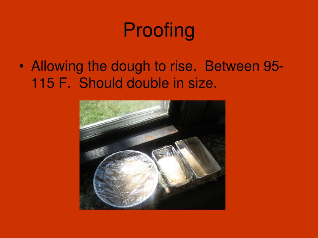 Proofing • Allowing the dough to rise. Between 95-115 F. Should double in size.