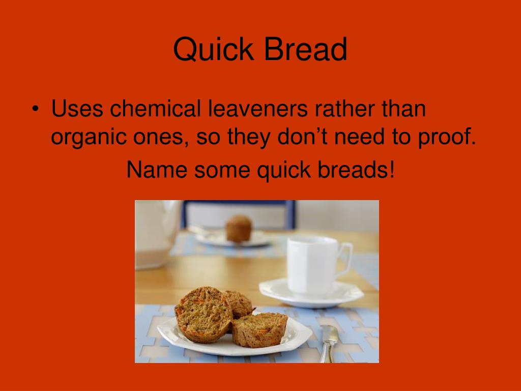 Quick Bread • Uses chemical leaveners rather than organic ones, so they don’t need to proof. Name some quick breads!