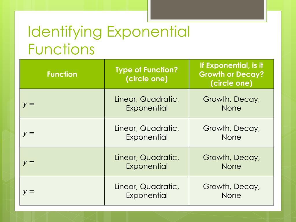 MAT 150 Algebra Class #16. Topics: Graphing and Apply Exponential Functions Transforming Exponential Functions. Review. Properties of Exponents on pages 309-312. Exponential Functions. Identifying Exponential Functions. Graphing Exponential Functions. 1. Graph for .