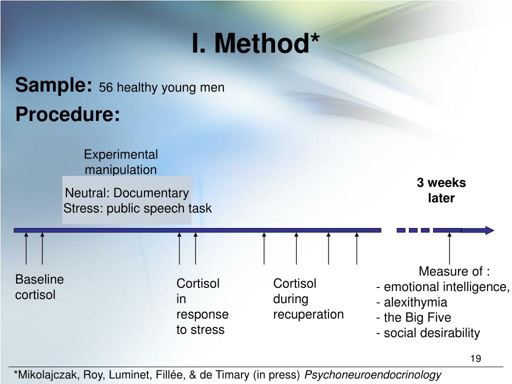 Experimental manipulation 3 weeks later Neutral: Documentary Stress: public speech task • Measure of : • emotional intelligence, • alexithymia • the Big Five • - social desirability Baseline cortisol Cortisol in response to stress Cortisol during recuperation I. Method* Sample:56 healthy young men Procedure: *Mikolajczak, Roy, Luminet, Fillée, & de Timary (in press) Psychoneuroendocrinology