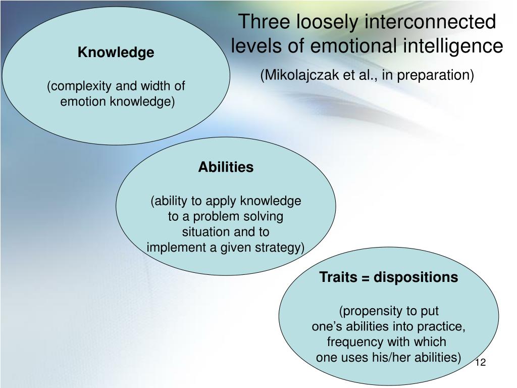 Three loosely interconnected levels of emotional intelligence (Mikolajczak et al., in preparation) Knowledge (complexity and width of emotion knowledge) Abilities (ability to apply knowledge to a problem solving situation and to implement a given strategy) Traits = dispositions (propensity to put one’s abilities into practice, frequency with which one uses his/her abilities)