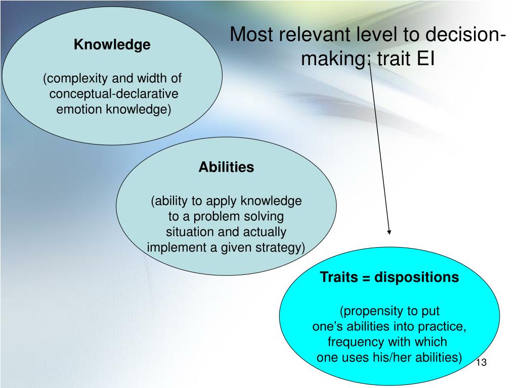 Knowledge (complexity and width of conceptual-declarative emotion knowledge) Most relevant level to decision-making: trait EI Abilities (ability to apply knowledge to a problem solving situation and actually implement a given strategy) Traits = dispositions (propensity to put one’s abilities into practice, frequency with which one uses his/her abilities)