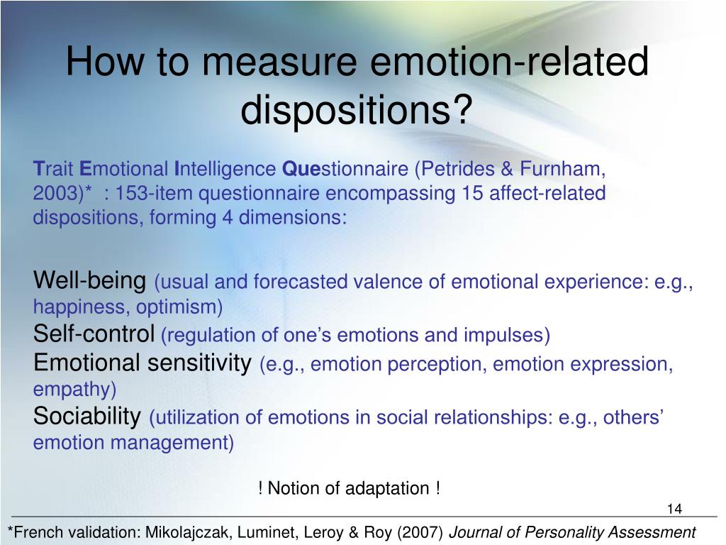 How to measure emotion-related dispositions? Trait Emotional Intelligence Questionnaire (Petrides & Furnham, 2003)* : 153-item questionnaire encompassing 15 affect-related dispositions, forming 4 dimensions: Well-being (usual and forecasted valence of emotional experience: e.g., happiness, optimism) Self-control(regulation of one’s emotions and impulses) Emotional sensitivity (e.g., emotion perception, emotion expression, empathy) Sociability (utilization of emotions in social relationships: e.g., others’ emotion management) ! Notion of adaptation ! *French validation: Mikolajczak, Luminet, Leroy & Roy (2007) Journal of Personality Assessment