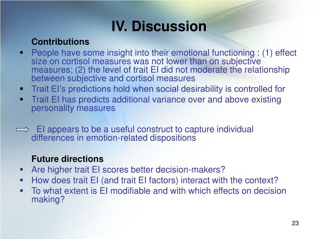 IV. Discussion Contributions • People have some insight into their emotional functioning : (1) effect size on cortisol measures was not lower than on subjective measures; (2) the level of trait EI did not moderate the relationship between subjective and cortisol measures • Trait EI’s predictions hold when social desirability is controlled for • Trait EI has predicts additional variance over and above existing personality measures EI appears to be a useful construct to capture individual differences in emotion-related dispositions Future directions • Are higher trait EI scores better decision-makers? • How does trait EI (and trait EI factors) interact with the context? • To what extent is EI modifiable and with which effects on decision making?