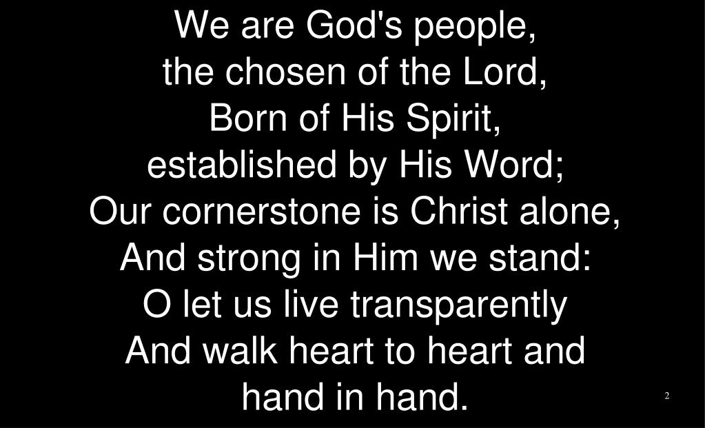We are God's people, the chosen of the Lord, Born of His Spirit, established by His Word; Our cornerstone is Christ alone, And strong in Him we stand: O let us live transparently And walk heart to heart and hand in hand.