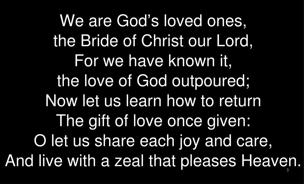 We are God’s loved ones, the Bride of Christ our Lord, For we have known it, the love of God outpoured; Now let us learn how to return The gift of love once given: O let us share each joy and care, And live with a zeal that pleases Heaven.