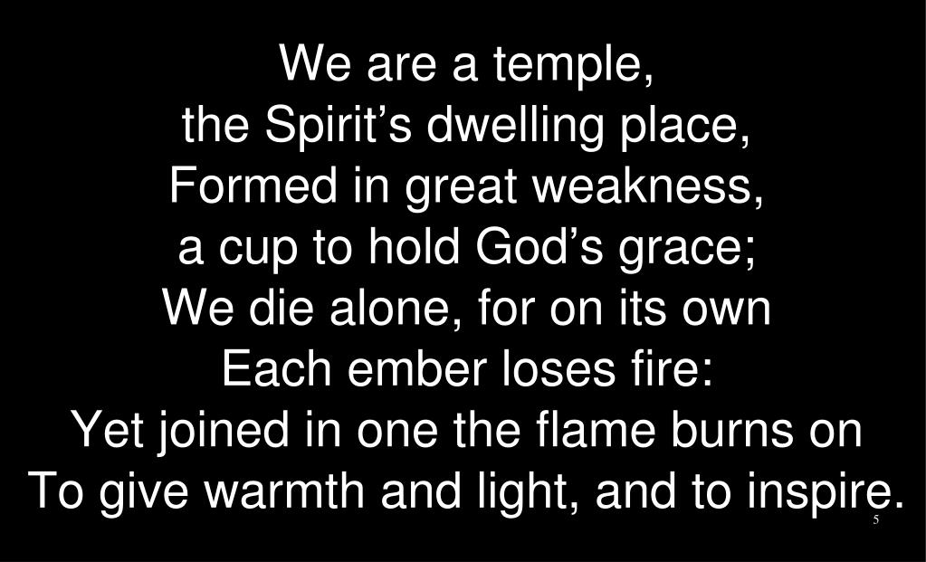 We are a temple, the Spirit’s dwelling place, Formed in great weakness, a cup to hold God’s grace; We die alone, for on its own Each ember loses fire: Yet joined in one the flame burns on To give warmth and light, and to inspire.