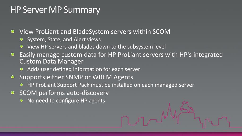 HP Server MP Summary • View ProLiant and BladeSystem servers within SCOM • System, State, and Alert views • View HP servers and blades down to the subsystem level • Easily manage custom data for HP ProLiant servers with HP's integrated Custom Data Manager • Adds user defined information for each server • Supports either SNMP or WBEM Agents • HP ProLiant Support Pack must be installed on each managed server • SCOM performs auto-discovery • No need to configure HP agents