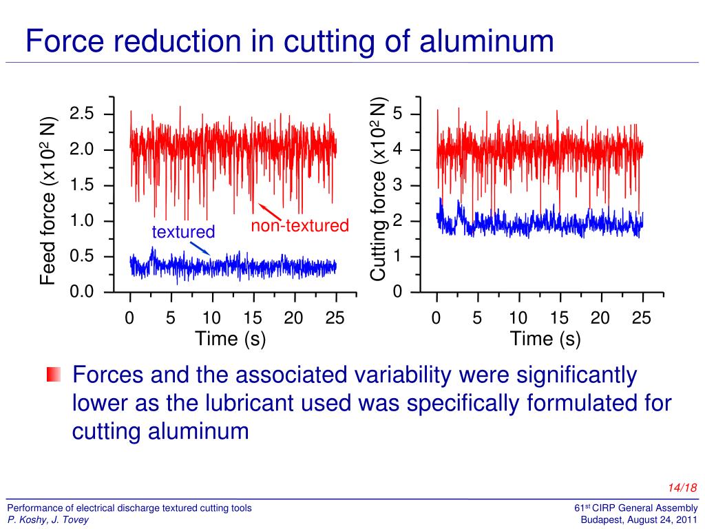 chip tool Fc Ff friction angle Experimental - Cutting • In comparison to surface roughness and tool life, machining force is a better indicator of lubrication effectiveness, in terms of repeatability and resolution De Chiffre & Belluco (2000) Performance of electrical discharge textured cutting tools P. Koshy, J. Tovey 61st CIRP General Assembly Budapest, August 24, 2011