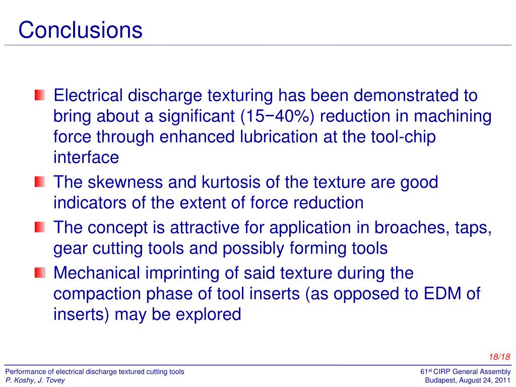 Conclusions • Electrical discharge texturing has been demonstrated to bring about a significant (15−40%) reduction in machining force through enhanced lubrication at the tool-chip interface • The skewness and kurtosis of the texture are good indicators of the extent of force reduction • The concept is attractive for application in broaches, taps, gear cutting tools and possibly forming tools • Mechanical imprinting of said texture during the compaction phase of tool inserts (as opposed to EDM of inserts) may be explored Performance of electrical discharge textured cutting tools P. Koshy, J. Tovey 61st CIRP General Assembly Budapest, August 24, 2011