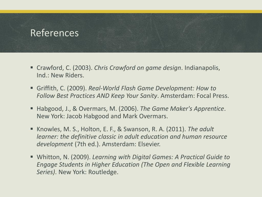 References • Crawford, C. (2003). Chris Crawford on game design. Indianapolis, Ind.: New Riders. • Griffith, C. (2009). Real-World Flash Game Development: How to Follow Best Practices AND Keep Your Sanity. Amsterdam: Focal Press. • Habgood, J., & Overmars, M. (2006). The Game Maker's Apprentice. New York: Jacob Habgood and Mark Overmars. • Knowles, M. S., Holton, E. F., & Swanson, R. A. (2011). The adult learner: the definitive classic in adult education and human resource development (7th ed.). Amsterdam: Elsevier. • Whitton, N. (2009). Learning with Digital Games: A Practical Guide to Engage Students in Higher Education (The Open and Flexible Learning Series). New York: Routledge.