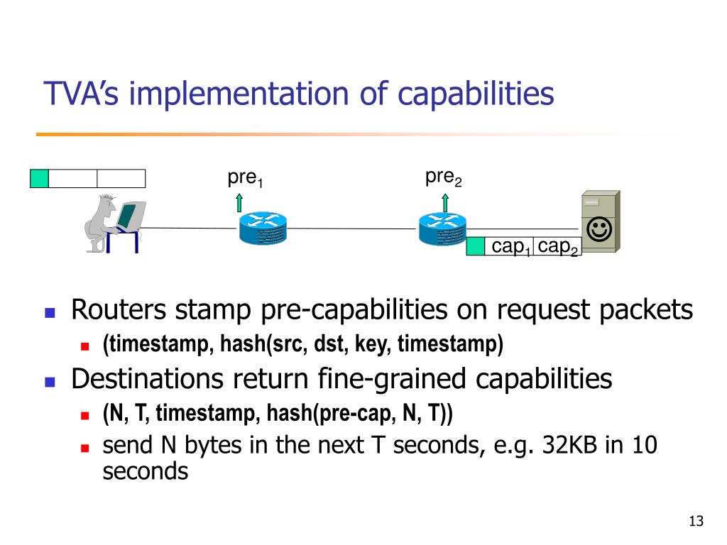 Sketch of the capability approach • Source requests permission to send. • Destination authorizes source for limited transfer, e.g, 32KB in 10 secs • A capability is the proof of a destination’s authorization. • Source places capabilities on packets and sends them. • Network filters packets based on capabilities. cap