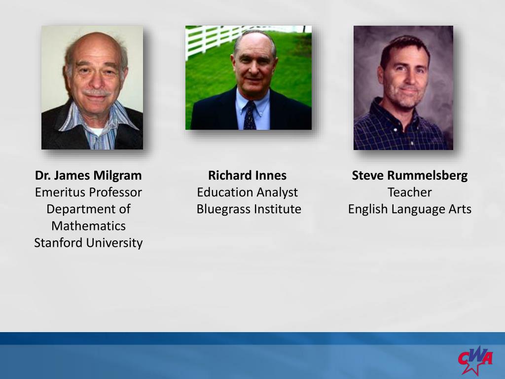 Dr. James MilgramEmeritus Professor Department of Mathematics • Stanford University Richard Innes Education Analyst Bluegrass Institute • Steve Rummelsberg • Teacher English Language Arts