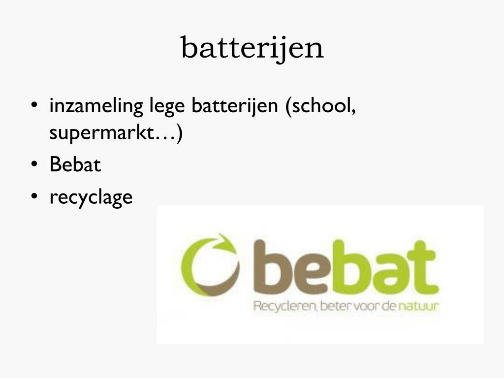 batterijen • inzameling lege batterijen (school, supermarkt…) • Bebat • recyclage