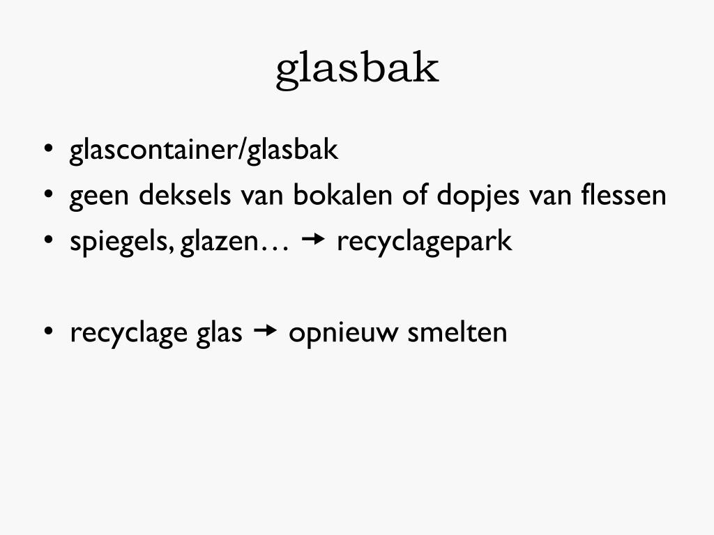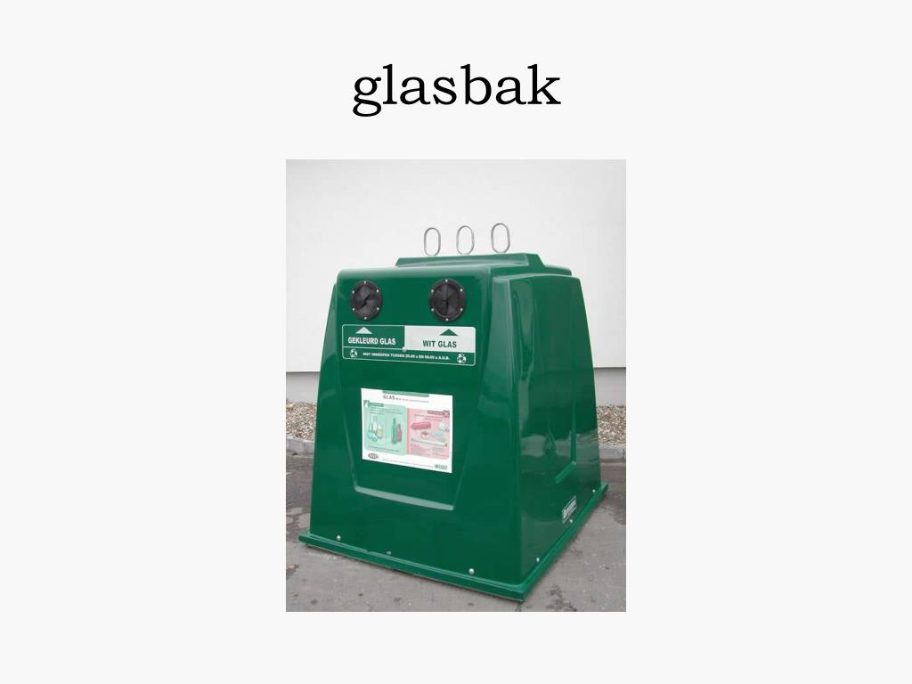 glasbak • glascontainer/glasbak • geen deksels van bokalen of dopjes van flessen • spiegels, glazen… recyclagepark • recyclage glas opnieuw smelten
