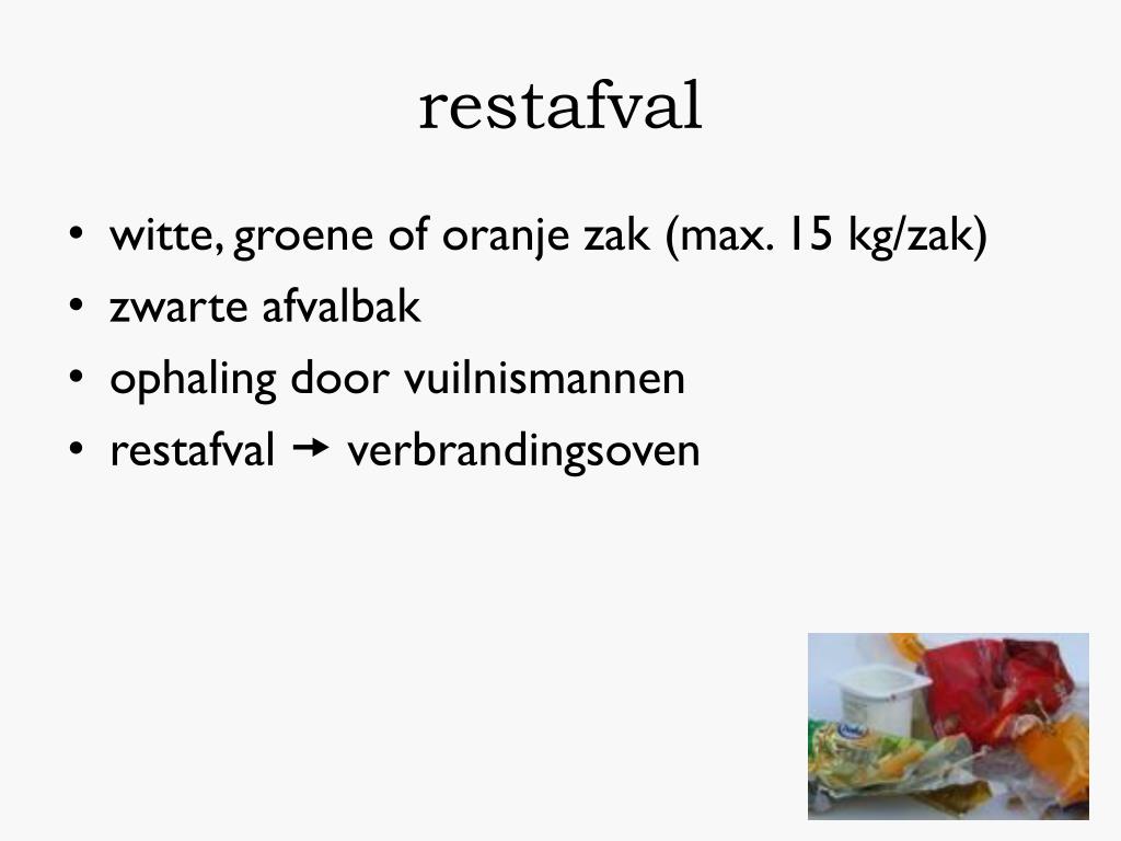 restafval • witte, groene of oranje zak (max. 15 kg/zak) • zwarte afvalbak • ophaling door vuilnismannen • restafval verbrandingsoven