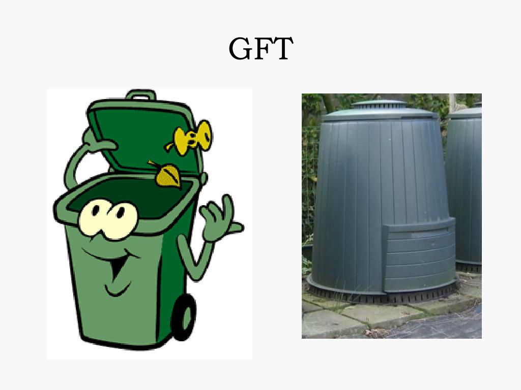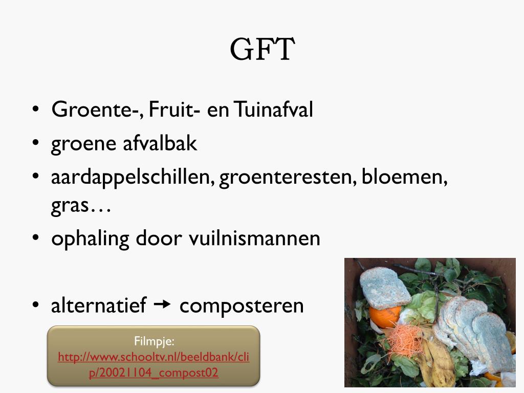 GFT • Groente-, Fruit- en Tuinafval • groene afvalbak • aardappelschillen, groenteresten, bloemen, gras… • ophaling door vuilnismannen • alternatief composteren Filmpje: http://www.schooltv.nl/beeldbank/clip/20021104_compost02