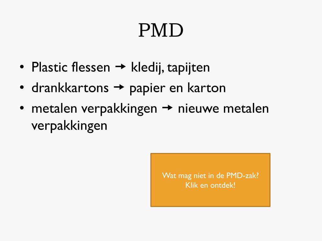 PMD • Plastic flessen kledij, tapijten • drankkartons papier en karton • metalen verpakkingen nieuwe metalen verpakkingen Wat mag niet in de PMD-zak? Klik en ontdek!