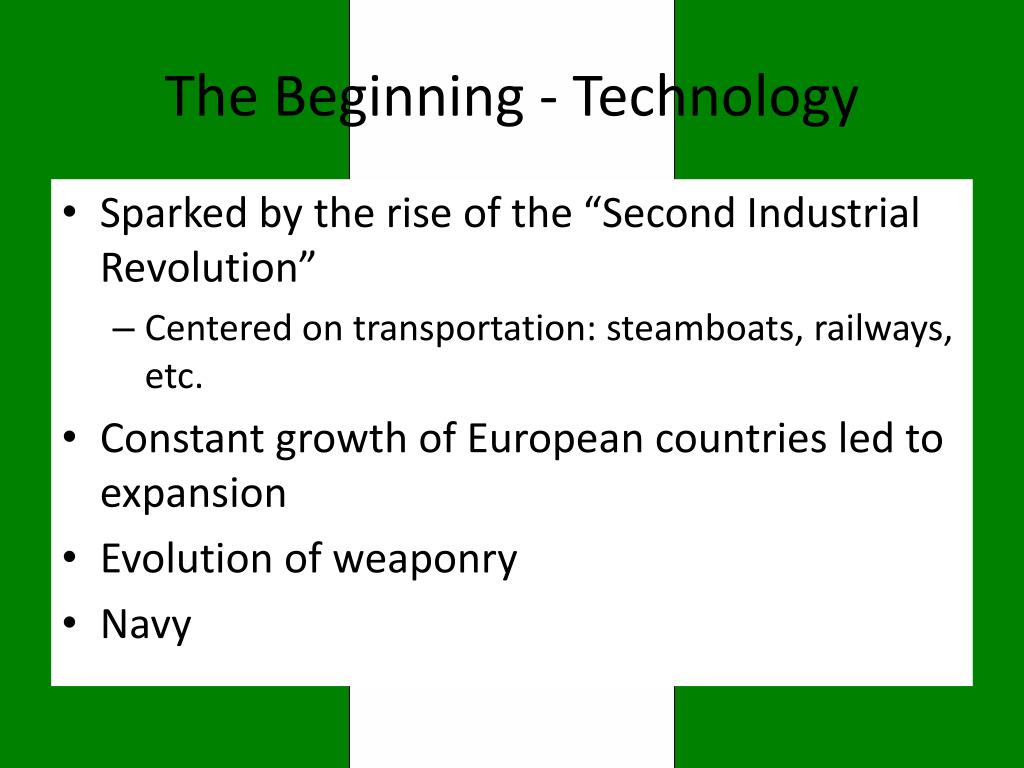 The Beginning - Technology • Sparked by the rise of the “Second Industrial Revolution” • Centered on transportation: steamboats, railways, etc. • Constant growth of European countries led to expansion • Evolution of weaponry • Navy