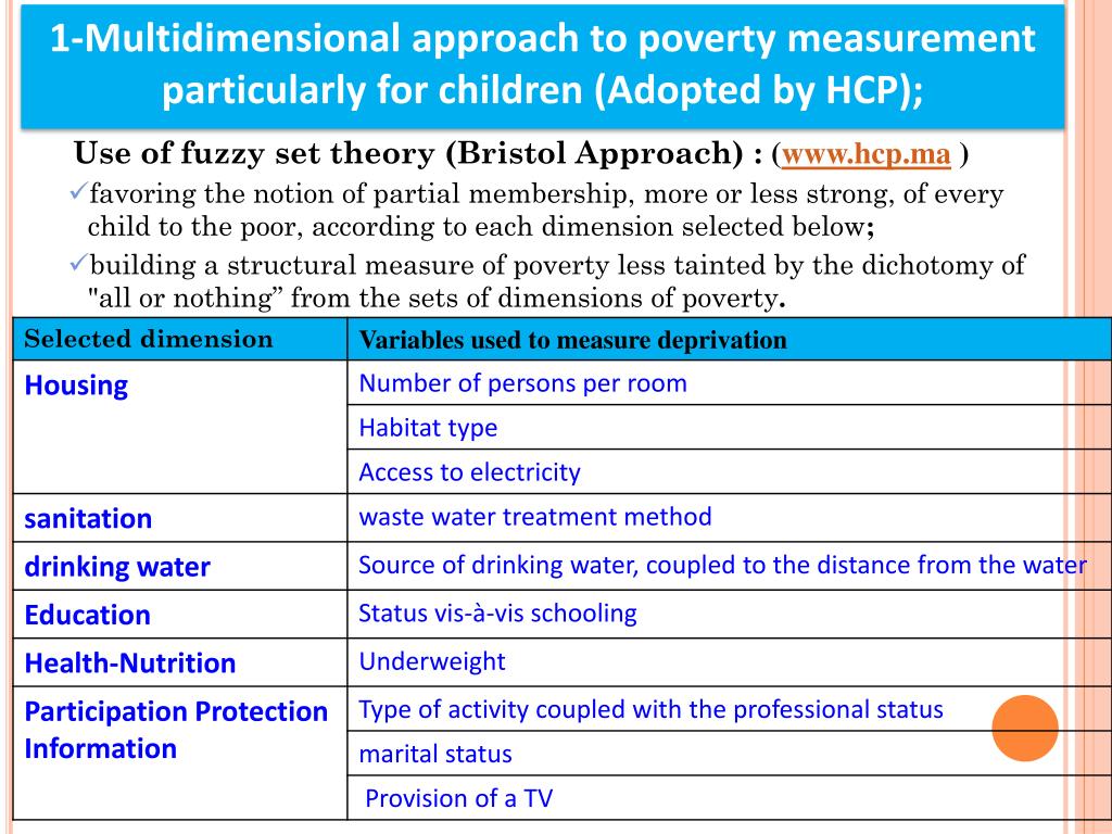 Use of fuzzy set theory (Bristol Approach) : (www.hcp.ma ) • favoring the notion of partial membership, more or less strong, of every child to the poor, according to each dimension selected below; • building a structural measure of poverty less tainted by the dichotomy of "all or nothing” from the sets of dimensions of poverty. 1-Multidimensional approach to poverty measurement particularly for children (Adopted by HCP);