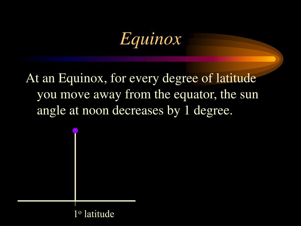Equinox At an Equinox, for every degree of latitude you move away from the equator, the sun angle at noon decreases by 1 degree.
