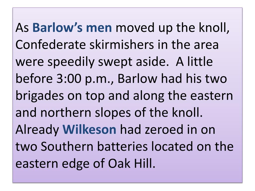As Barlow’s men moved up the knoll, Confederate skirmishers in the area were speedily swept aside. A little before 3:00 p.m., Barlow had his two brigades on top and along the eastern and northern slopes of the knoll. Already Wilkeson had zeroed in on two Southern batteries located on the eastern edge of Oak Hill.