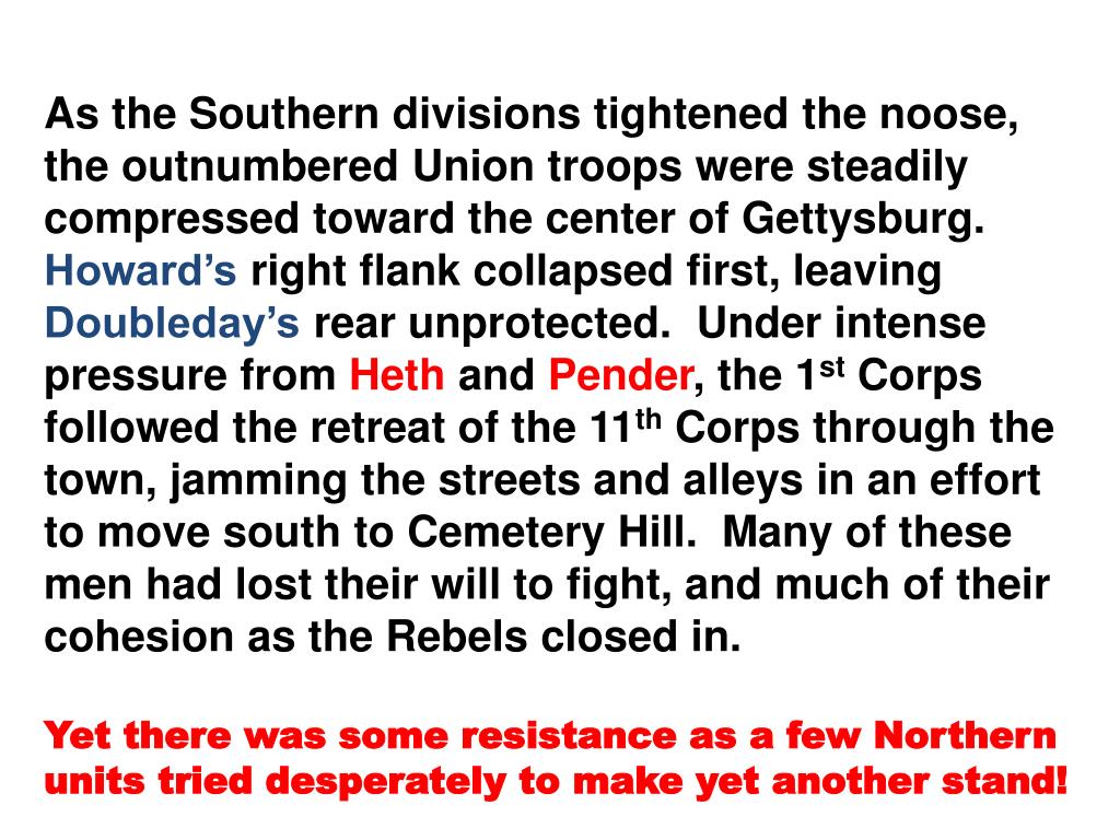 As the Southern divisions tightened the noose, the outnumbered Union troops were steadily compressed toward the center of Gettysburg. Howard’s right flank collapsed first, leaving Doubleday’s rear unprotected. Under intense pressure from Heth and Pender, the 1st Corps followed the retreat of the 11th Corps through the town, jamming the streets and alleys in an effort to move south to Cemetery Hill. Many of these men had lost their will to fight, and much of their cohesion as the Rebels closed in. Yet there was some resistance as a few Northern units tried desperately to make yet another stand!