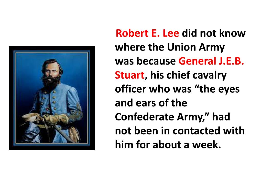 Robert E. Lee did not know where the Union Army was because General J.E.B. Stuart, his chief cavalry officer who was “the eyes and ears of the Confederate Army,” had not been in contacted with him for about a week.