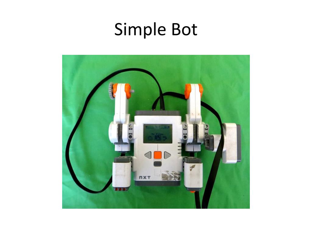 Simple Bot. NxT + four Technics Pegs. Insert Technics Pegs. Motors and Sensors. Attach Motors and Sensors. Get Ultrasonic Sensor. Attach Ultrasonic sensor-make sure connectors are not blocked. Get Wires. Attach Motors to Ports B&C.