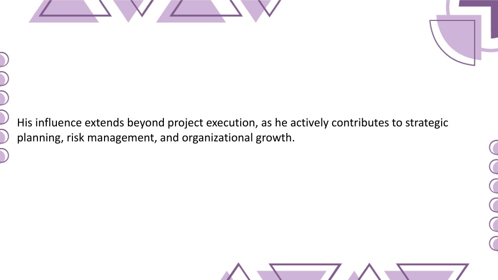 His influence extends beyond project execution, as he actively contributes to strategic planning, risk management, and organizational growth.