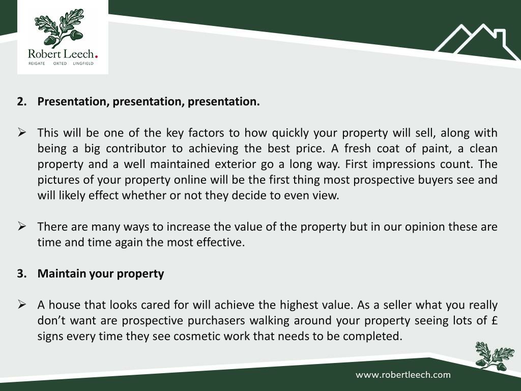 Spruce your house and garden up • This can be completed at a relatively low cost, with paint, a new carpet and a few well-placed pot plants. If your property looks, fresh, new and modern purchasers will pay the premium to not have to do the work themselves. • Written by Michelle Cheshire, Senior Negotiator Oxted.