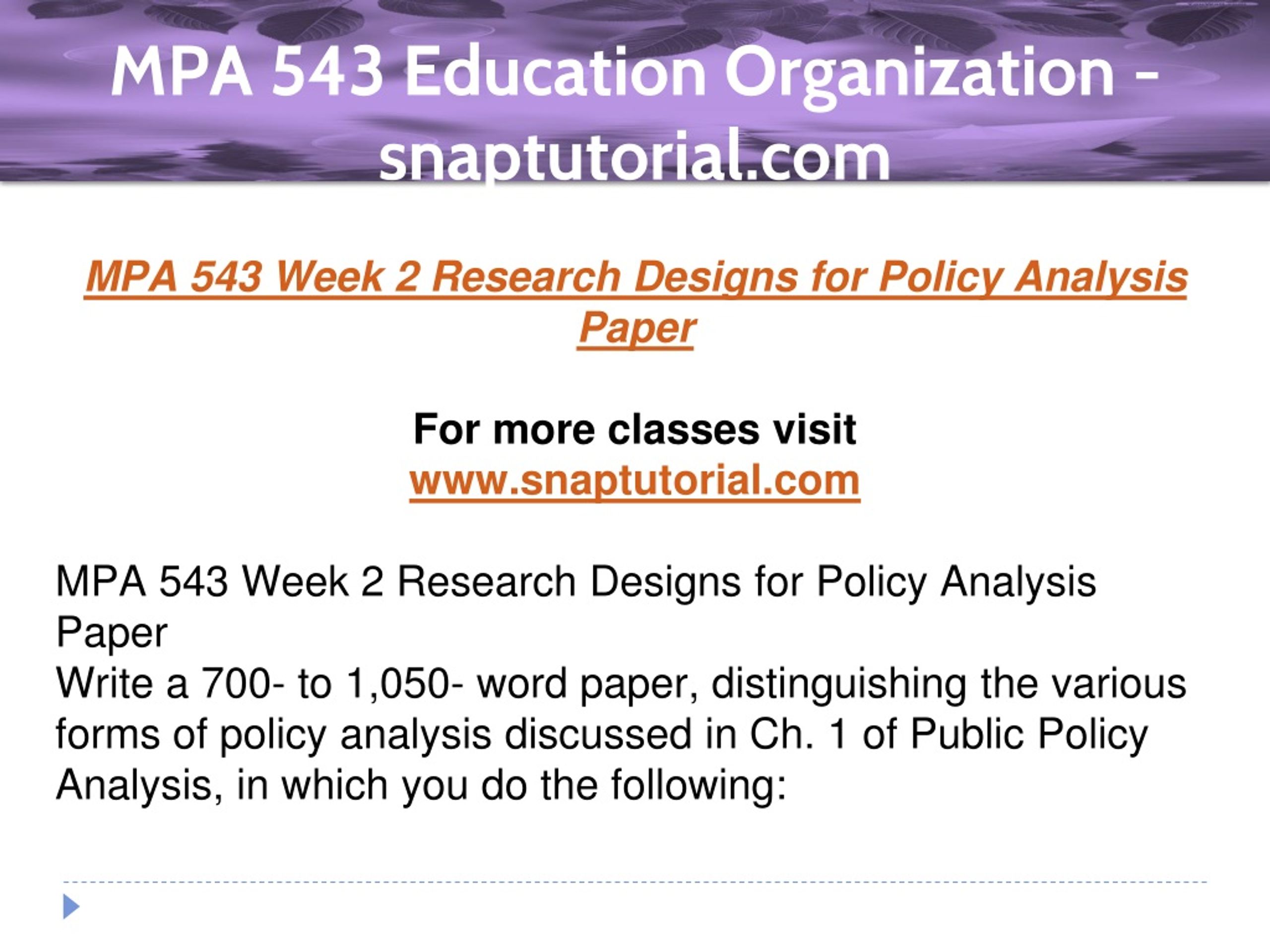 MPA 543 Education Organization - snaptutorial.com MPA 543 Week 2 Research Designs for Policy Analysis Paper For more classes visit www.snaptutorial.com MPA 543 Week 2 Research Designs for Policy Analysis Paper Write a 700- to 1,050- word paper, distinguishing the various forms of policy analysis discussed in Ch. 1 of Public Policy Analysis, in which you do the following: