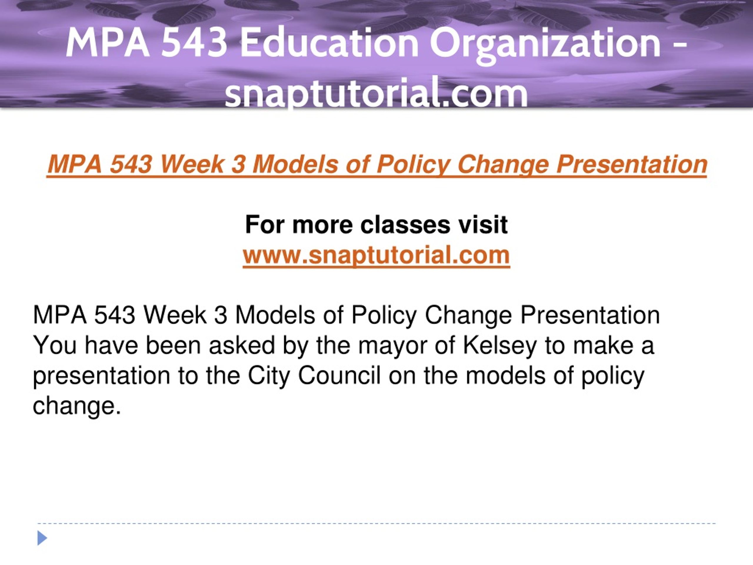 MPA 543 Education Organization - snaptutorial.com MPA 543 Week 3 Models of Policy Change Presentation For more classes visit www.snaptutorial.com MPA 543 Week 3 Models of Policy Change Presentation You have been asked by the mayor of Kelsey to make a presentation to the City Council on the models of policy change.