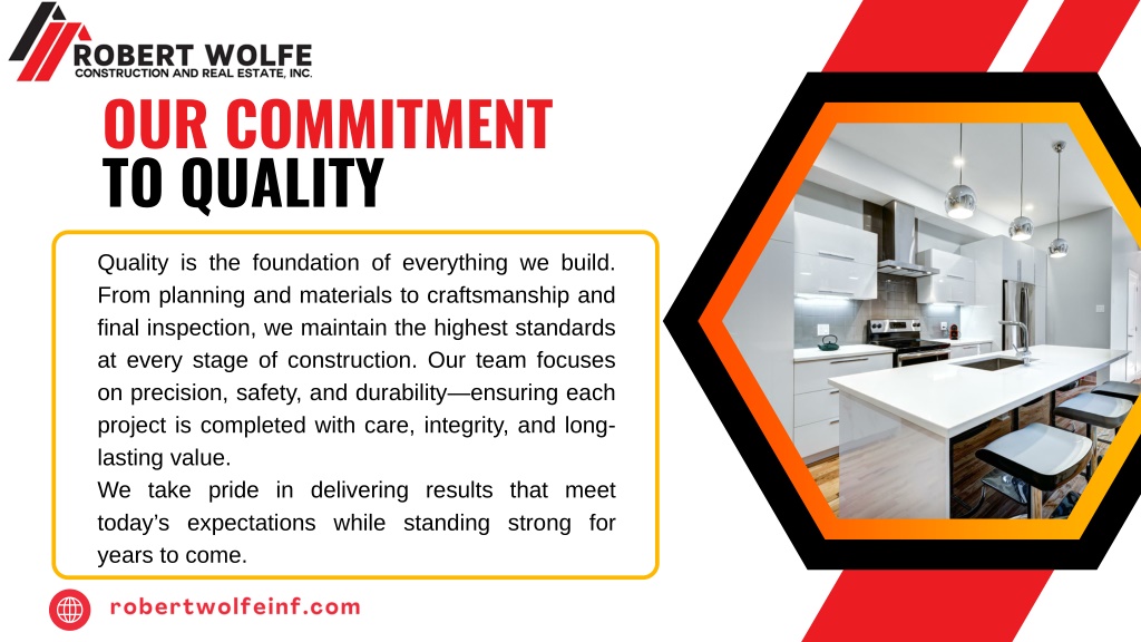 OUR COMMITMENT TO QUALITY Quality is the foundation of everything we build. From planning and materials to craftsmanship and final inspection, we maintain the highest standards at every stage of construction. Our team focuses on precision, safety, and durability—ensuring each project is completed with care, integrity, and long-lasting value. We take pride in delivering results that meet today’s expectations while standing strong for years to come. robertwolfeinf.com