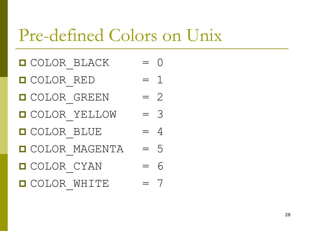 Pre-defined Colors on Unix • COLOR_BLACK = 0 • COLOR_RED = 1 • COLOR_GREEN = 2 • COLOR_YELLOW = 3 • COLOR_BLUE = 4 • COLOR_MAGENTA = 5 • COLOR_CYAN = 6 • COLOR_WHITE = 7