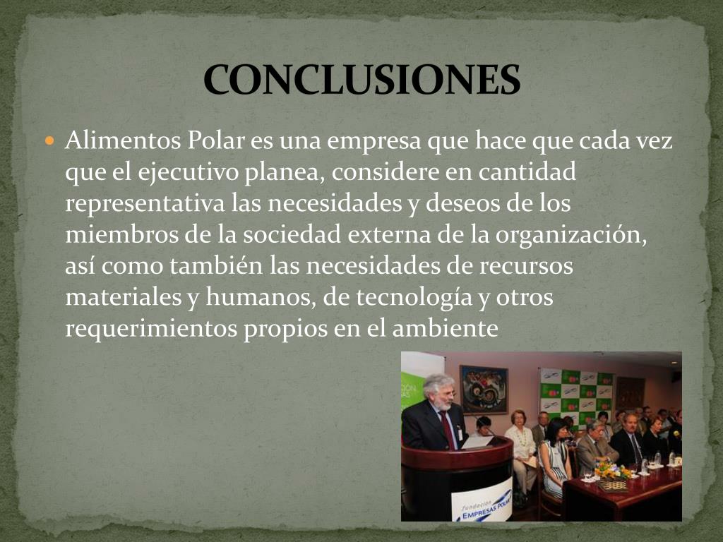 CONCLUSIONES • Alimentos Polar es una empresa que hace que cada vez que el ejecutivo planea, considere en cantidad representativa las necesidades y deseos de los miembros de la sociedad externa de la organización, así como también las necesidades de recursos materiales y humanos, de tecnología y otros requerimientos propios en el ambiente