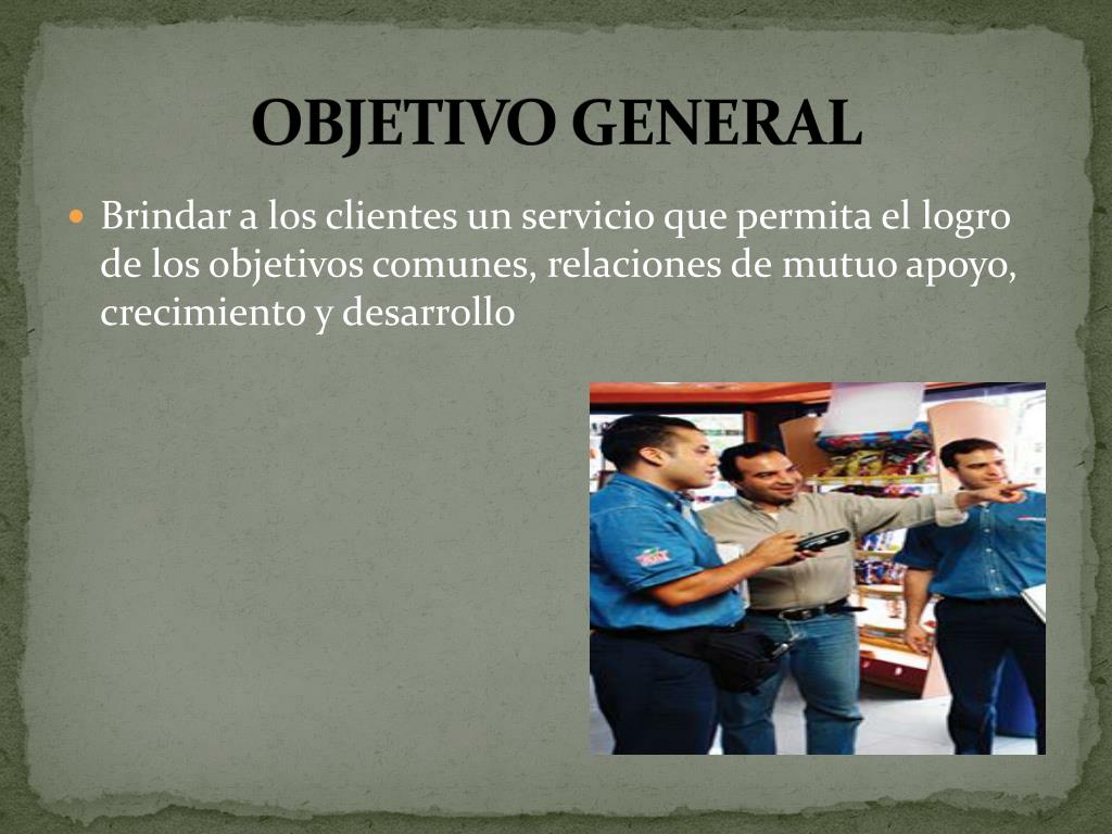 OBJETIVO GENERAL • Brindar a los clientes un servicio que permita el logro de los objetivos comunes, relaciones de mutuo apoyo, crecimiento y desarrollo