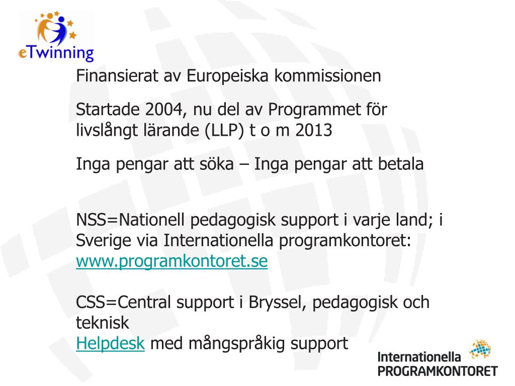 Finansierat av Europeiska kommissionen Startade 2004, nu del av Programmet för livslångt lärande (LLP) t o m 2013 Inga pengar att söka – Inga pengar att betala NSS=Nationell pedagogisk support i varje land; i Sverige via Internationella programkontoret: www.programkontoret.se CSS=Central support i Bryssel, pedagogisk och teknisk Helpdesk med mångspråkig support