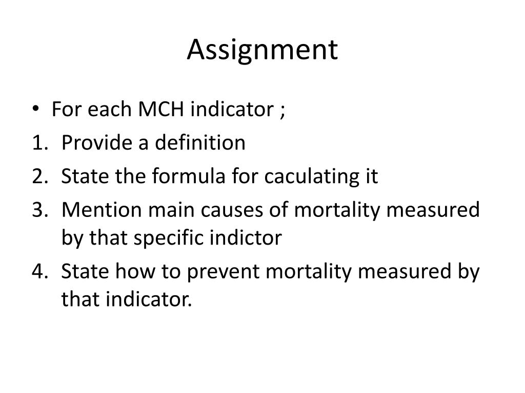 Assignment • For each MCH indicator ; • Provide a definition • State the formula for caculating it • Mention main causes of mortality measured by that specific indictor • State how to prevent mortality measured by that indicator.
