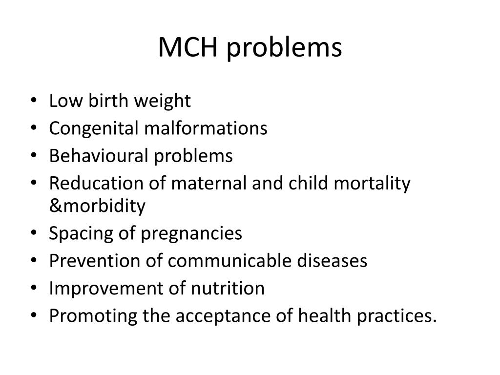 MCH problems • Low birth weight • Congenital malformations • Behavioural problems • Reducation of maternal and child mortality &morbidity • Spacing of pregnancies • Prevention of communicable diseases • Improvement of nutrition • Promoting the acceptance of health practices.